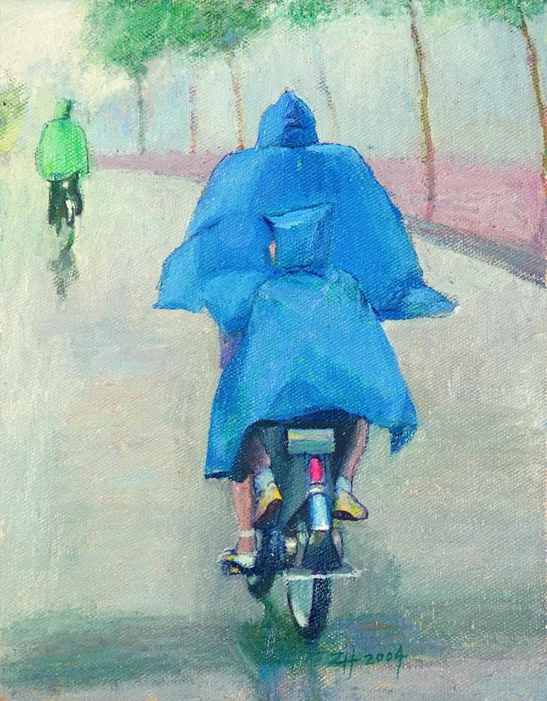 近年每逢夏天,京城的雨多雨大并不亞于南方。我畫了《今夏雨多》系列 ,分別稱作為《大雨》、《中雨》、《小雨》。雨中有共撐一把傘的戀人,有冒雨送孩子上學的母親,還有掃街的環衛女工和電話亭沒完沒了私語的時髦女郎交集在同一雨景中。