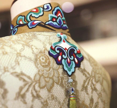 研修班結業成果,海派旗袍設計師苗海燕與唐卡技藝傳承人申支足共同完成的堆繡旗袍。(均上海公共藝術協同創新中心供圖)