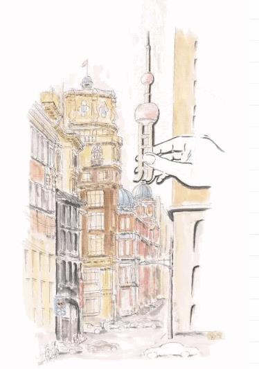 整片城市老街景,被鑲嵌在書中,那些上海的紅色屋頂是童話的顏色。爺叔想表達什么?左側翻書的大手和男女后腦勺都沒上色啊,下方小鳥尾巴怎么伸出了畫面,他解釋說,“這是夢中的效果”。
