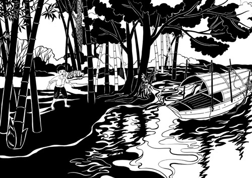 許是累了,厭倦了,過了一頓煙工夫,水活雙腳安靜下來了。不知不覺,兩行清淚從他紅撲撲的臉頰滑下來。天藍得高且遠,白云像一葉葉沒有拋錨的疍家船,沒有方向,也沒有目的,任意漂流;又像一個個搖搖晃晃的醉漢,時笑時哭,分明在嘲笑水活是一個野孩子——跟那些經常沖他指指點點的人一樣,讓人憎厭。十歲的水活又來氣了,雙腳在水里不停地蹬起來,濺起的水花更白了,跳得更遠了,一群群順流而下的小魚兒被嚇得魂飛魄散,四處逃竄。
