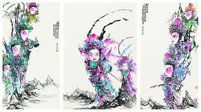 值得指出的是,畫家以戲曲、古典人物為題材,運用夸張大寫意的手法,顯現其作品風格的靈性特征是經過一番擷選、取舍的。他每每下筆著墨,總表現出畫家濃厚的主觀情感色彩,而且大多取情懷激越的特寫構圖,占據畫面中心大半的位置,通過琳瑯的色彩與墨的交疊透出某種具有裝飾趣味的舞臺效果。不論是戲曲中的生旦凈丑,還是仕女小品,甚或是花卉、小動物等,連綴畫面意象的都是畫家流瀉的情緒。人與物象在畫家筆下,已不是具體的某個對象;而是一種創作的橋梁媒介、一種精神寓寄的承載體。即如作品《硝煙鐵戈》《三英圖》《五花洞》中所反映出來的對某種品味的追求,某種境界的追求,某種精神的袒露。