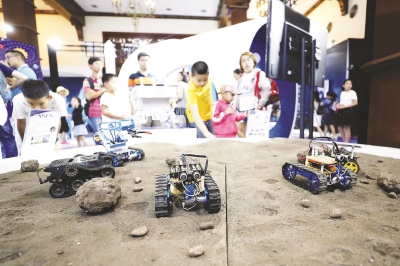 月球車模型在模擬的月球上進行科學測試。本報記者袁婧攝