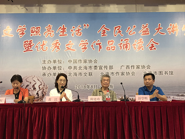 8月23日,中國作協“文學照亮生活”全民公益大講堂2018年第六講活動在廣西壯族自治區北海市圖書館舉行,中國作協副主席、作家陳建功為北海市500多位基層作家和文學愛好者作題為《改革開放40年文學的基本脈絡》的講座?;顒佑芍袊鲄f創聯部主任彭學明主持,北海市委常委、宣傳部部長、副市長黃江致辭。廣西自治區文聯黨組書記白志繁、北海市文聯主席韋曉紅等出席活動。