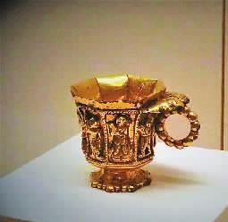 何家村窖藏出土的伎樂紋八棱金杯 本報記者 李韻攝/光明圖片