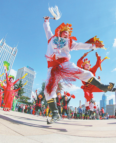 圖為民間藝人表演國家級非物質文化遺產“海陽大秧歌”。