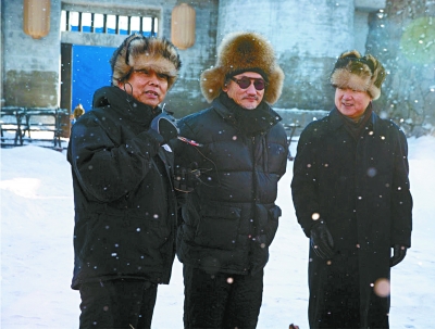 拍《智取威虎山》時, 于冬、徐克、黃建新在片場合影(右起)