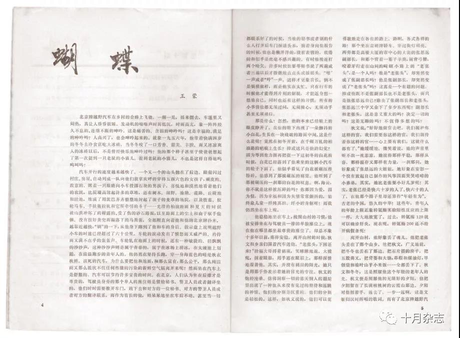 從創刊至今,《十月》對中篇小說發展做出的貢獻尤其值得提及??飫撧k人之一的資深老編輯、散文家張守仁說:“當時那些月刊一期就十幾萬字,所以發一個中篇就了不得了,而我們一期就發三四個。從‘五四’以來,還從來沒有刊物這樣做。 可以說,《十月》引發了中篇小說的第一個高潮。同時,我們抓緊時機,召開了一個中篇小說座談會,把很多作家都請來參加,推動中篇小說這個體裁的發展?!笔聦嵉拇_如此??梢哉f,在中篇小說領域,能夠與《十月》雜志抗衡的刊物幾乎沒有?!妒隆返闹衅≌f獲得的全國性獎項(“魯獎”和“全國優秀中篇小說獎”)有十八部之多。更重要的不是數量,而是這些作品的巨大影響力。比如王蒙的《蝴蝶》,鄧友梅的《追趕隊伍的女兵們》,劉紹棠的《蒲柳人家》,宗璞的《三生石》,張承志的《黑駿馬》《北方的河》,鐵凝的《沒有紐扣的紅襯衫》《永遠有多遠》,張賢亮的《綠化樹》,賈平凹的《臘月·正月》,張一弓的《張鐵匠的羅曼史》,葉廣芩的《夢也何曾到謝橋》,方方的《斷琴口》等,都是三十多年來中篇小說最重要的作品。
