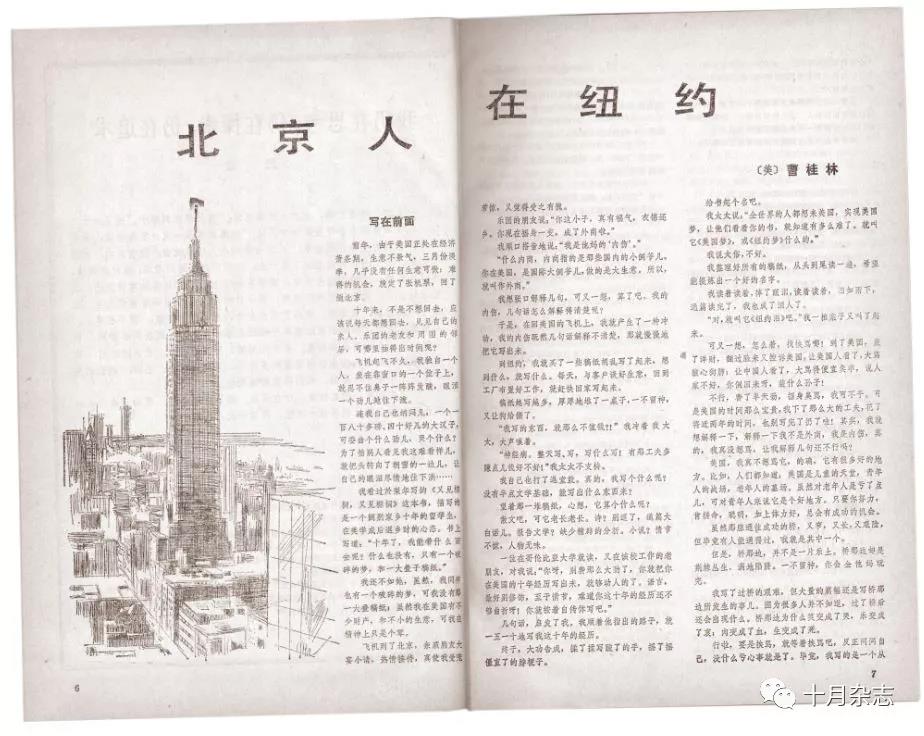 長篇小說也是《十月》的一個傳統。1981年的四、五兩期,連載了張潔的長篇小說《沉重的翅膀》。這是改革開放以來第一部以改革為題材的長篇小說。小說發表后雖然引起各方面的爭議甚至非常尖銳,但通過修訂后,小說獲得了第二屆茅盾文學獎;1983年四期的《十月》,發表了李國文的長篇小說《花園街五號》。小說通過一座特殊建筑發生的故事,深刻而生動地講述了政治文化與社會歷史變革的關系。那里既有刀光劍影鐵血交鋒,亦有英雄氣短兒女情長。它實現了作家通過小說“是想為在這場變革中,披荊斬棘,沖鋒陷陣的勇士、斗士唱一支贊歌”,“是替他們吶喊:大家來關心這場改革,支持這場改革,并且投身到這場改革洪流中來”(李國文語)的情懷和期許;1991年四期,《十月》發表了曹桂林的《北京人在紐約》。小說開啟了另外一種風尚,這種風尚可以概括為中國人在美國的成功想象。那個時代,文學界有一種強烈的“走向世界”的渴望,有一種強烈的被強勢文化承認的心理要求。這種欲望或訴求本身,同樣隱含著一種“悲情”歷史的文化背景:越是缺乏什么就越是要突顯什么。因此它是“承認的政治”的文化心理在文學上的表達。小說表現的是中國男人或女人在美國的成功,尤其是他們商業的成功?!爸袊降闹腔邸痹诋愑蚴欠衲軌驎承袩o阻并不重要,重要的是這些作品使中國的大眾文化在市場上喜出望外。一時間里,權威傳媒響徹著“千萬里我追尋著你,可是你卻并不在意”,來自紐約的神話幾乎家喻戶曉。作品的文學價值雖然并不高,它在文化市場的成功,為中國大眾文化的興起臨時性地添加了異國情調以及中國人的“美國想象”。