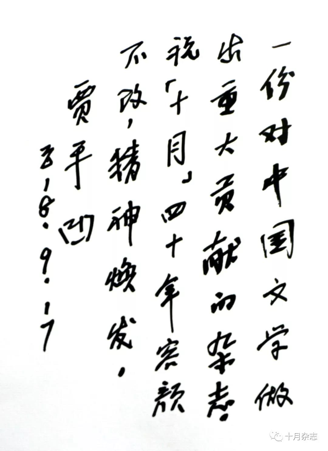 最后賈平凹祝!妒隆穭摽氖苣,并題字:“《十月》是對中國文學也做出了巨大貢獻的雜志,!妒隆匪氖耆蓊伈桓,精神煥發!