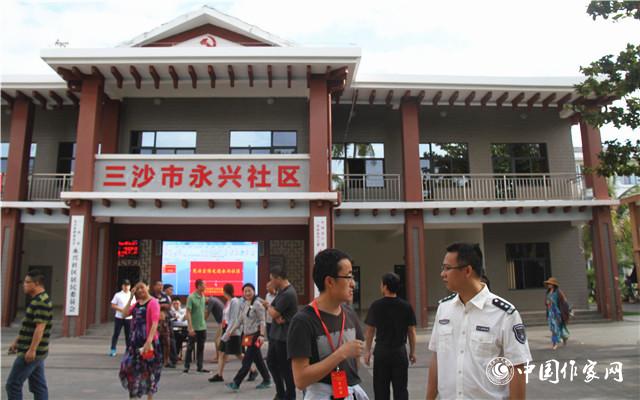 一排排嶄新的二層小樓房,整潔干凈的道路綠草如茵,雞蛋花、月季花正肆意怒放,一個美麗的現代化海島村莊映入眼簾。在永興社區的漁民定居點,采訪團的作家們與一位姓林的老先生交談起來,他本來是工委的干部,大學畢業就來這里,在島上工作居住了37年,現在已經退休,可謂是看著永興島在改革開放以來一步一步從無到有、越來越好。談起過去的住宿、飲水困難,他感慨地說,“現在真的太好了!以前住木板房,現在住樓房,再也不怕臺風來了!”看到村民們臉上蕩漾著幸福的笑容,大家感慨萬千。海南作協專職副主席梅國云曾在四年前來到這里,他說,“四年前漁民們告訴我,他們有兩個憂慮,一個是孩子的教育問題,另一個是居住問題。但是四年后的今天,我再度上島,發現和四年前比完全不一樣,漁民們的住房絕不比??诘氖忻駰l件差!”