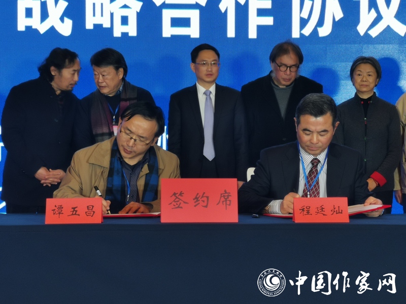 譚五昌代表海子詩歌獎評委會,程廷燦代表懷寧縣人民政府,簽署了海子詩歌獎永久落戶安徽懷寧戰略合作協議的簽約儀式。