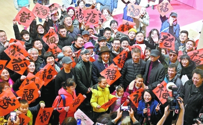 新年第一天,中國美術館里人頭攢動,來館里看展覽的觀眾收獲了一份額外大禮。由館長吳為山帶領的藝術家現場揮毫,將一幅幅喜氣洋洋的“?!弊炙偷搅擞^眾的手中。
