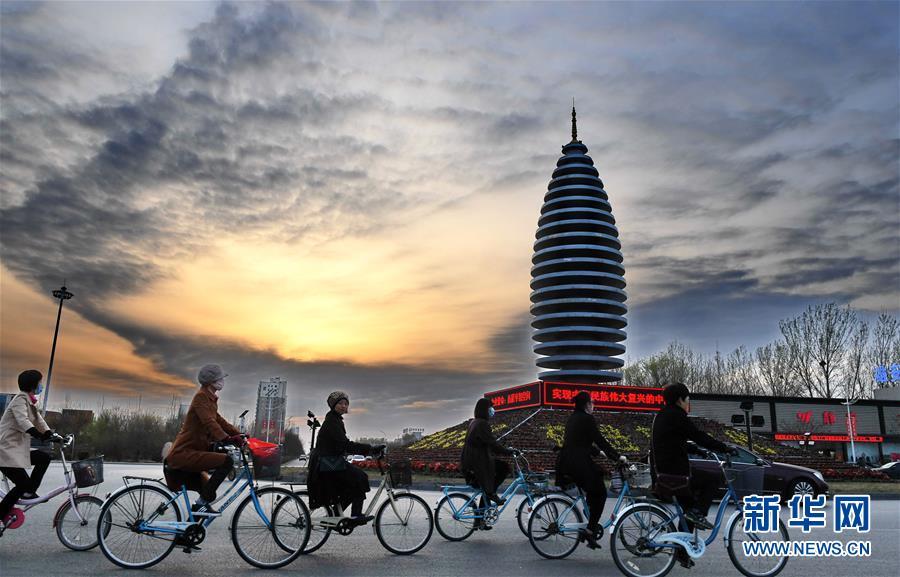 市民在河北雄安新區容城縣縣城道路上騎行(2018年3月29日攝)。新華社記者 牟宇攝
