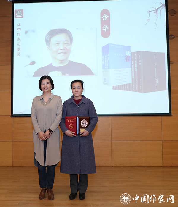 張亞麗向優秀作家貢獻獎獲得者余華頒獎,其責任編輯代為領獎