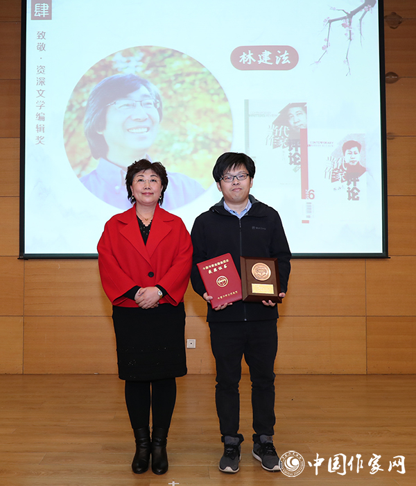 徐坤向致敬·資深文學編輯獎獲得者林建法頒獎,編輯代為領獎