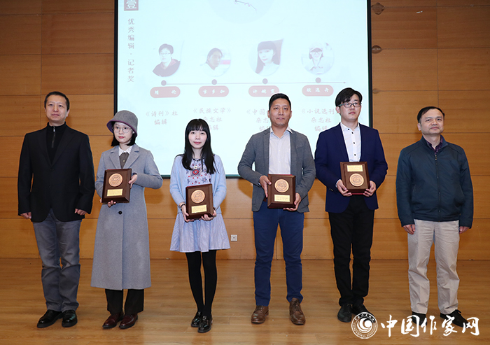鮑堅、施戰軍為優秀編輯(記者)獎獲得者楊海蒂、任晶晶、錢英、王婉頒獎