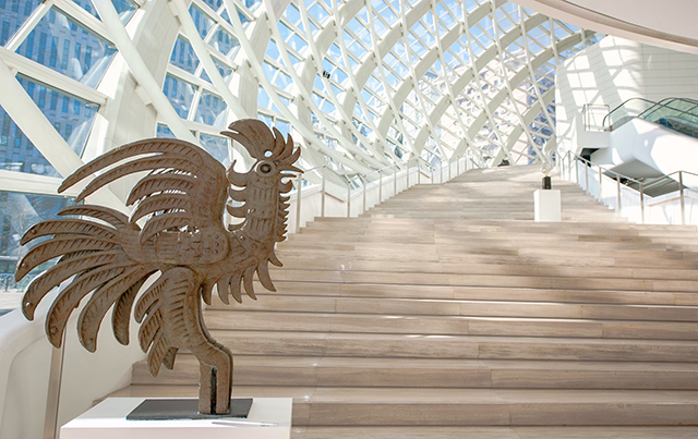 位于北京東三環附近的鳳凰中心擁有獨特的建筑風格,其造型創意來源于莫比烏斯環,空間與文化在拓撲的意義上被連接了起來,所形成的連續整體感與錯落交織的層次及環形結構,象征著鳳凰本身的特征屬性,展現包容與開放的藝術風格。作為鳳凰衛視2019年的年度大展,“美無止境——韓美林的雕塑世界”作品展在此舉辦,暗合著一段藝術精品與建筑佳作的奇妙緣分。主辦方表示,該展覽冀望以建筑的無限性來回應韓美林藝術生命之永恒,詮釋了建筑、雕塑與心靈之間不可分割的因緣。通過這些作品的展示,當代藝術與現代建筑實現了完美融合,更加展現出強烈的視覺張力。二者的結合相映成輝,仿佛構成了一幅穿越時空、超越地域、在交融中創造著無限未來的美妙畫作。