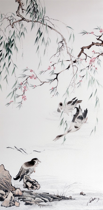 周海云 春江水暖鴨先知 單面繡 真絲 100×50cm 2018 中國美術館藏