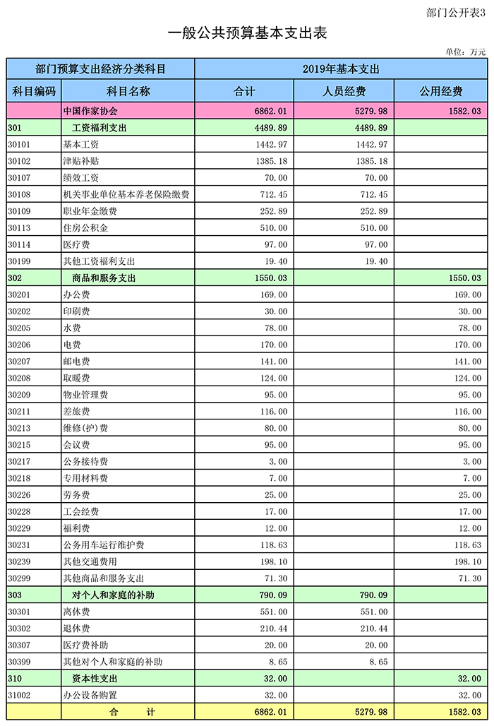 中國作家協會2019年一般公共預算基本支出 6862.01萬元,其中: