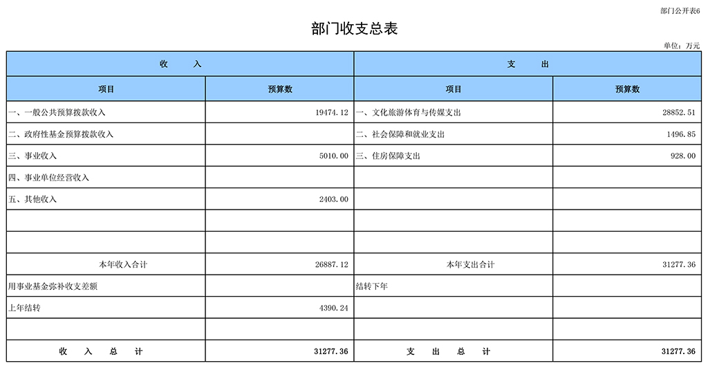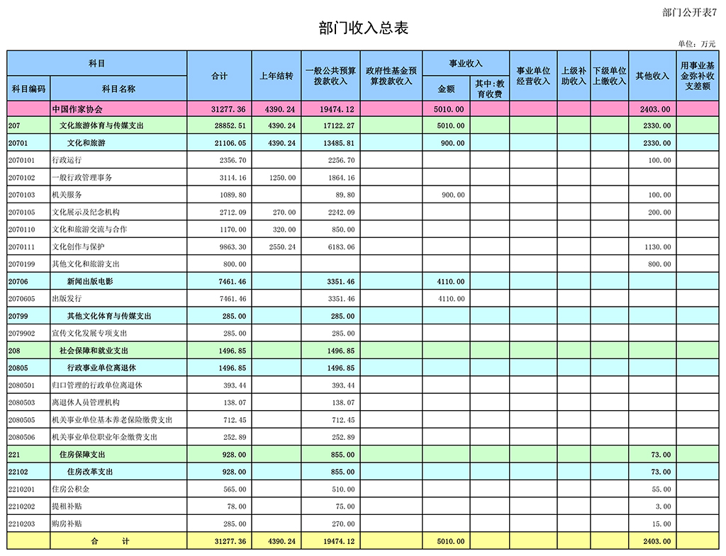 按照綜合預算的原則,中國作家協會所有收入和支出均納入部門預算管理。收入包括:一般公共預算撥款收入、事業收入、事業單位經營收入、其他收入、上年結轉。支出包括:文化旅游體育與傳媒支出、社會保障和就業支出、住房保障支出。中國作家協會2019年收支總預算31277.36萬元。