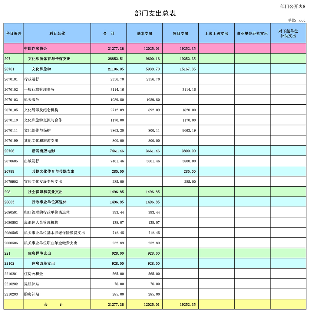(八)文化旅游體育與傳媒(類)文化和旅游(款)一般行政管理事務(項):指中國作協本級組織作家深入生活等文學活動所需的項目支出。