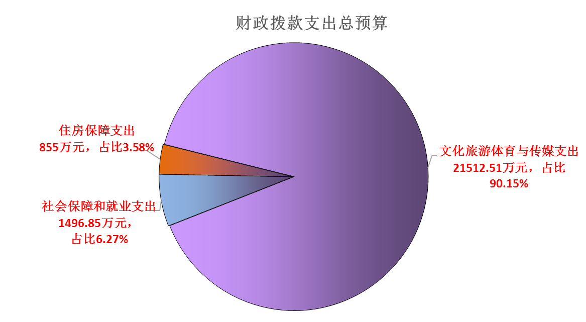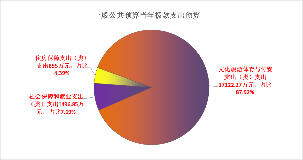 文化旅游體育與傳媒支出(類)支出17122.27萬元,占比87.92%;社會保障和就業支出(類)支出1496.85萬元,占比7.69%;住房保障支出(類)支出855萬元,占比4.39%。