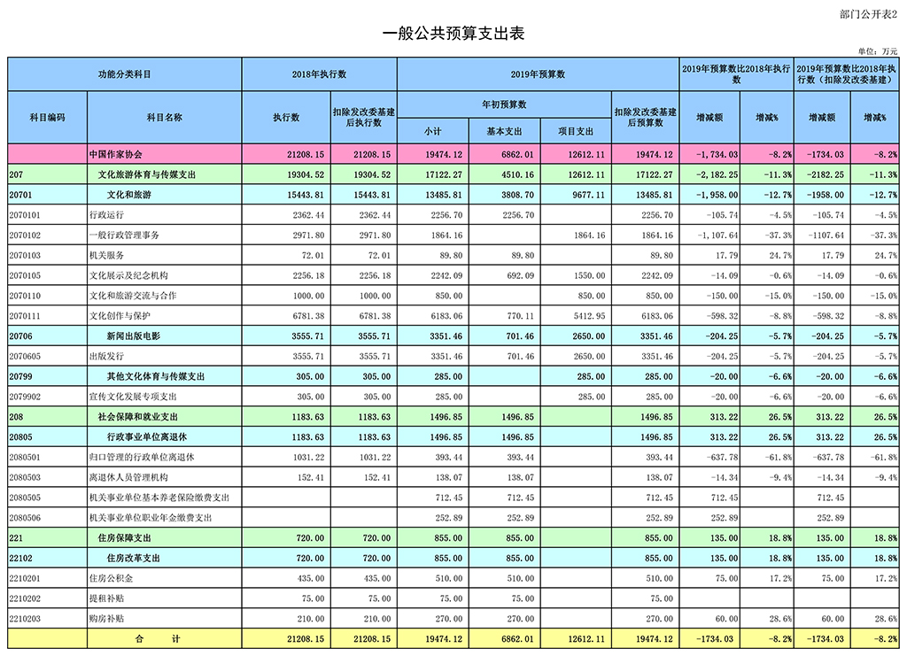 (十二)文化旅游體育與傳媒(類)文化和旅游(款)文化創作與保護(項):指中國作協本級及所屬單位開展扶持文學創作活動和魯迅文學院開展教學活動所需的各項支出。