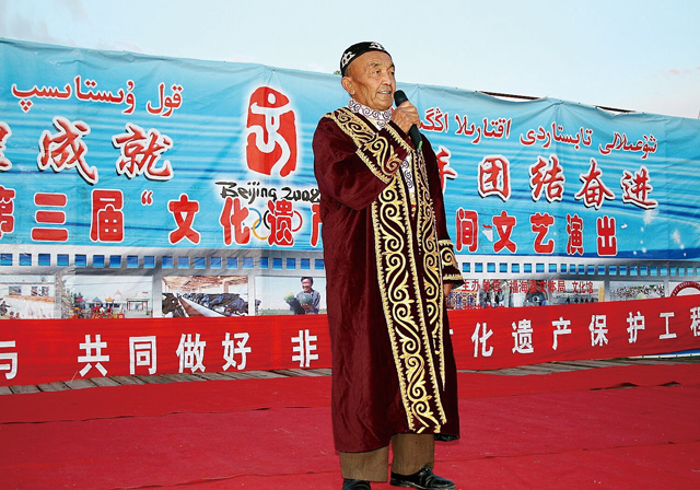 達斯坦奇是民間對長詩演唱藝人的一種尊稱。在歷史發展的長河中,達斯坦奇對于我國北方少數民族的文化發展和傳承具有重要意義和價值。然而,由于達斯坦傳承的特殊性,達斯坦演唱不同于一般的故事、歌謠。達斯坦演唱者不僅要求知識淵博,反應敏捷,記憶力超強,而且還要有駕馭語言的天資,以及能言善辯和卓越的藝術表現力。因此,達斯坦演唱者即使在長詩盛行的時代,其演唱大師也為數不多。隨著民族文化的不斷發展,新的文藝表現形式不斷涌現,能演唱達斯坦的人可謂鳳毛麟角,再加上達斯坦演唱是一種自娛自樂、文化自然傳承的形式,并不是演唱者唯一的謀生手段,也不是一種相對固定的職業,所以受當代文化的影響,學習演唱長詩的人越來越少。特別是近30年以來,原有的師徒傳承形式在民間幾乎很少見,達斯坦演唱后繼無人,而能演唱達斯坦的大都是耄耋之年的老人。