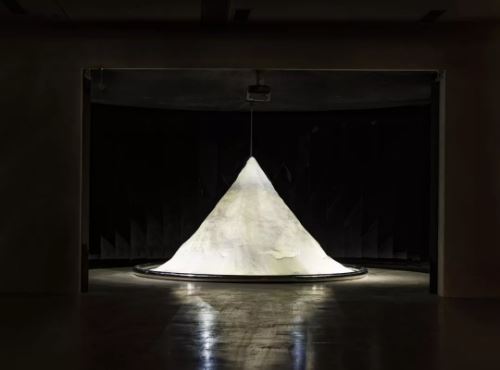 《沙器》 武寧亞 純白海沙、沙漏、不銹鋼構件 360 x 240cm 2018