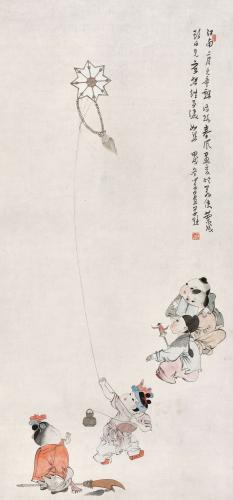 溥心畬1934年繪制的《江南二月兒童戲》近七平尺,題材和尺幅均不多見,五位嬰童姿態各異,視線聚焦在高處的紙鳶,意趣盎然。