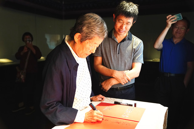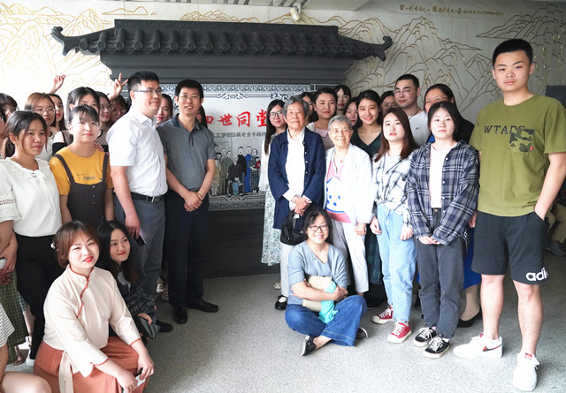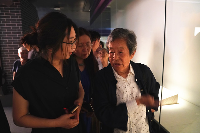 舒濟(右)參觀展覽,中國現代文學館征集編目部王雪博士(左)進行講解