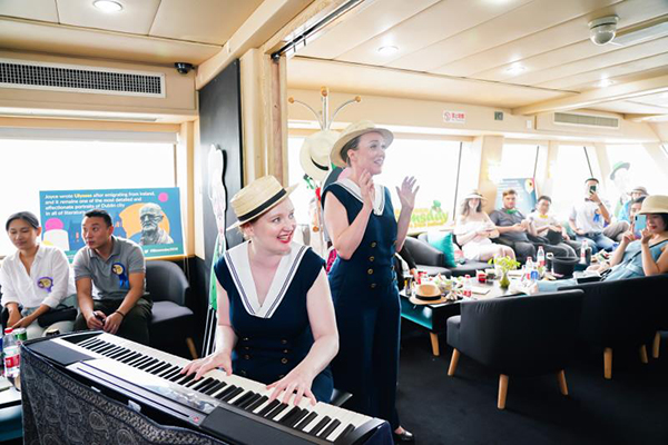 上海作為文化藝術重地,愛爾蘭駐上??傤I事館已經連續多年舉辦生動熱烈的活動來慶祝布魯姆日。6月16日的黃浦江畔,烈日灼灼,一群戴著彩色領結、愛爾蘭草編帽和白色羽毛胸針的游客顯得格外引人注目。在江邊游輪上,擺放著布魯姆的巨幅彩色畫像,還有手風琴、豎琴和一摞摞厚厚的《尤利西斯》。走進船中,宛如置身《尤利西斯》中的經典場景,如:Joyce畫廊、Davy Byrne酒吧、Molly的客廳、及Sandymount Strand海濱。賓客們身著斑斕的禮服,品嘗著都柏林風味的芝士蛋糕,在奏響的音樂聲中探訪喬伊斯的內心世界。