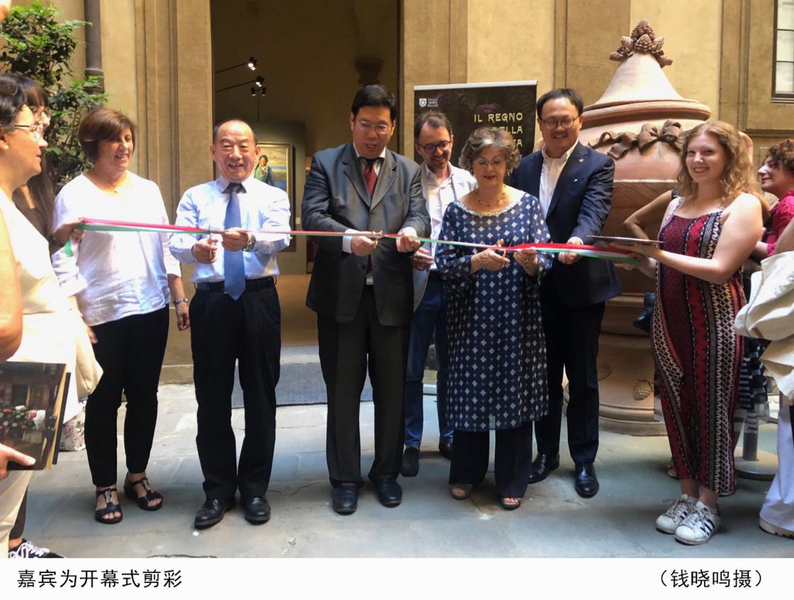 在參加開幕式嘉賓的熱烈掌聲和期盼中,中國駐意大利佛羅倫薩領事館總領事王文剛、意大利藝術研究院院長克麗絲蒂娜?阿齊蒂尼和畫家韓玉臣為展覽剪彩。