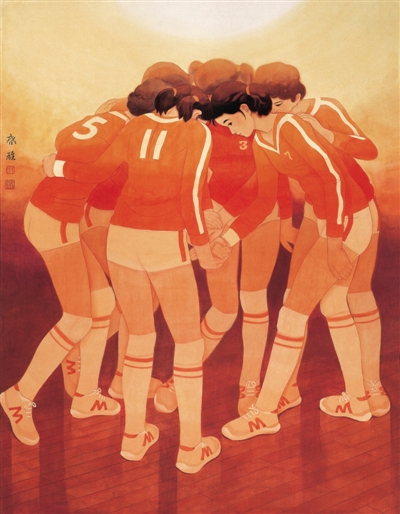 上世紀80年代,中國女排的姑娘們用汗水和拼搏向世人展現了她們“絕不拋棄,決不放棄”的精神。在1984年舉辦的第六屆全國美展上,“女排精神”出現在多個畫種中。徐啟雄中國畫《決戰之前》描繪了女排姑娘上場前圍作一圈擊掌加油的場景,人物造型質樸,構圖組織別致,溫暖的紅色調烘托出昂揚向上的氣氛。李慕白與金雪塵合作的年畫《女排奪魁》,則刻畫了一位手捧獎杯和排球、胸前佩戴金牌、站在國旗下的女排姑娘,在鮮花的簇擁中,她綻放出勝利者的微笑。朱達誠雕塑《熱淚》則另辟蹊徑,表現了女排姑娘艱難拿下關鍵一分后,在場上圍成一圈,蹦跳著、叫喊著,流下熱淚的激動瞬間,作品真實生動、感人至深。美術工作者們用自己的作品,從不同角度表現、傳遞“女排精神”,突破時空,凝固歷史,為新中國體育題材美術留下了閃爍著金色光芒的記憶。