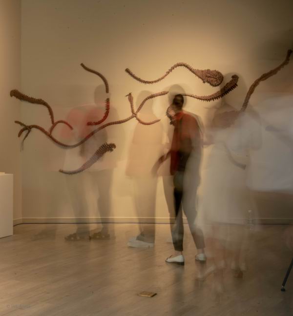 劉嘉穎解釋說,這個作品命名為《上下求索》,柿子樹“精靈”頭部一上一下地擊打著發光的大門,就像船漂泊在探索的海上隨著浪花一上一下…… 在海上,他們都是沒有根的,所以把中國原始的“柿子樹”保留一部分根倒置。大洋洲的原住民冒著生命危險探索新的世界,他們常常會做各種雕塑來嚇?!昂耗А?,女性形象象征繁衍,柿子樹的意象則象征物種的交流與傳播。因為柿子樹一開始只有中國才有,在明朝貿易往來時,柿子樹被傳到大洋洲?!拔以陂喿x文獻時,偶爾發現柿子樹的史料。我們在創作時,除了形態有含義外,希望材料本身也是具有文化屬性?!眲⒓畏f說。