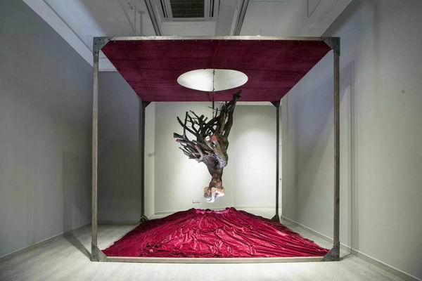 劉嘉穎以法國凱布朗利博物館藏的“馬拉甘雕塑”、“毛伊姆面具”、“祈愿板”三件展品為靈感,創作了《上下求索》,這是一件比較大型的裝置作品。懸掛在中間、有規律得做上下運動的是一棵倒置的帶根的“柿子樹”。朝下的樹干為雕刻的女性“精靈”造型,中間人臉部分借鑒的是“馬拉甘雕塑”造型,“毛伊姆面具”則在形態上做了一些變化,被放置在女“精靈”的頭部,“祈愿板”被抽象為絲帶,環繞在女“精靈”的胳膊上。