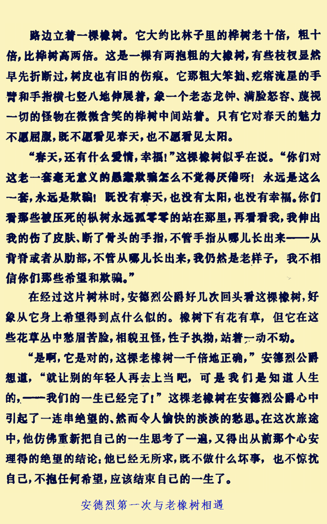 托爾斯泰善于通過描寫心理變化的過程展示人物思想性格的演變,俄羅斯文藝理論家車爾尼雪夫斯基將這種藝術特色命名為“心靈辯證法”?!稇馉幣c和平》中的著名片段“安德烈與老橡樹的兩次相遇”即運用心靈辯證法的方式寫出了安德烈的內心轉變。