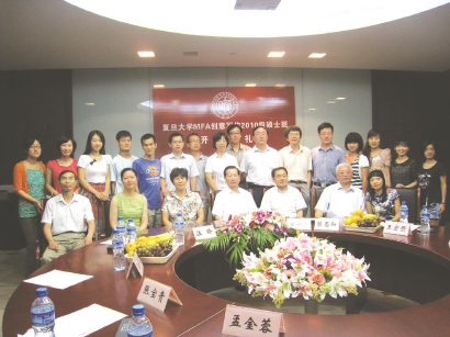 2010年9月復旦大學首屆MFA學生開學典禮,金炳華(左四)、王安憶(左二)、陳思和(右二)、虹影(右一)等作家、學者參加
