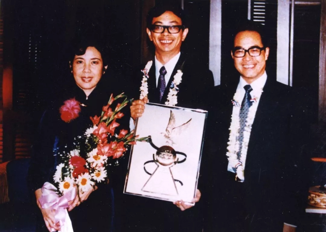 1983年3月,吳貽弓和石方禹(右)、鄭振瑤(左)于馬尼拉,《城南舊事》在第二屆馬尼拉國際電影節上獲獎后合影