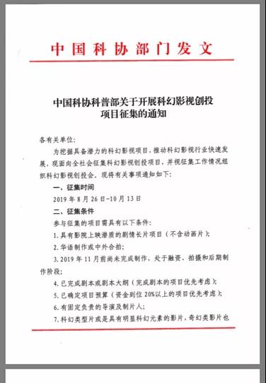 為了繁榮科幻影視創作、挖掘孵化具有市場潛力的科幻影視項目,2019中國科幻大會還特別設置科幻電影創投環節,由中國科協科普部于8月28日正式公布了《關于開展科幻影視創投項目征集通知》。
