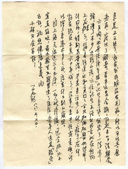 今晨冰心打電話來,說您給她的信中提到我沒有出席她的紀念會,可能是病了,關注到我的健康,十分心感。今春我到廣東去走了一圈,自不量力,十天內坐面包車跑了廣州、深圳、蛇口、珠海、中山、順德六個地方,一路能吃能睡,自我感覺良好,可是回到北京就患上了腰肌勞損。一時連拄著拐杖也不能走路了,西醫治了兩個星期反而越來越利(厲)害,后來有人介紹請中醫按摩同時服中藥,才開始好轉,現在總算可以坐起寫字,有人扶著也可以走路了,“傷筋動骨一百天”,我已經過了一百二十天了,人過了八十多,希望早日恢復,看來是不可能了,好在我內臟沒有毛病,所以可以告慰老友,度過了酷暑,看來還是會漸漸好起來的,請釋念。