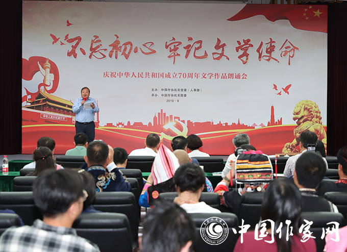 吉狄馬加在致辭中說,70年前,毛澤東同志向全世界莊嚴宣告中華人民共和國成立。70年櫛風沐雨,波瀾壯闊;70年砥礪奮進,滄海巨變。今年同樣是中國作協成立70周年。習近平總書記專門發來賀信勉勵我們,自覺承擔起舉旗幟、聚民心、育新人、興文化、展形象的使命任務,為繁榮發展社會主義文藝事業、建設社會主義文化強國,為實現“兩個一百年”奮斗目標、實現中華民族偉大復興中國夢作出新的更大的貢獻。我們走得再遠,都不能忘記來時的路。今天,我們隆重舉行此次文學作品朗誦會,慶祝新中國70周年華誕。讓我們共同祝愿偉大祖國的明天更加光輝燦爛,祝愿中國作協各項工作蒸蒸日上,祝愿社會主義文學事業更加發展繁榮。