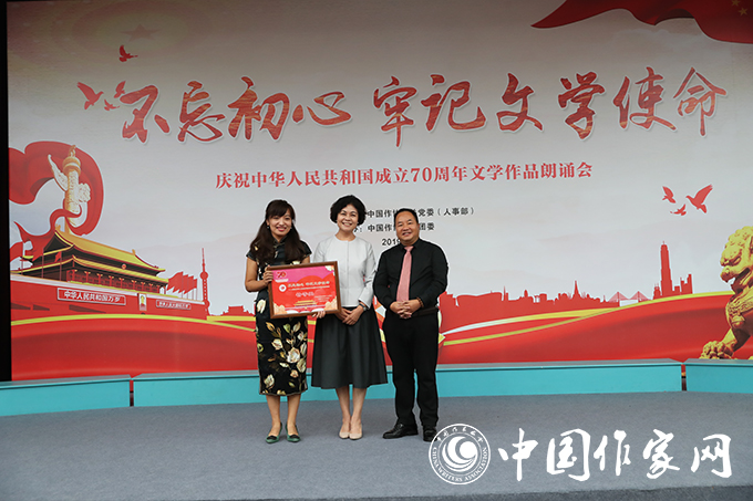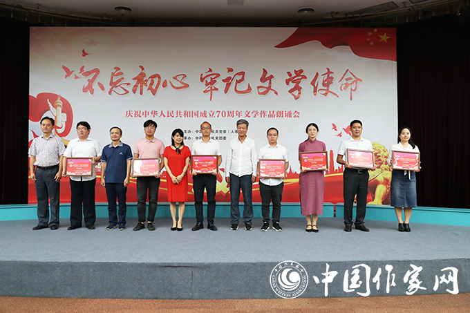 為進一步重溫近代以來中國人民和中華民族不懈奮斗的偉大歷程,回顧新中國成立70年來取得的偉大成就,引領和激勵中國作協干部職工堅持以習近平新時代中國特色社會主義思想為指導、為實現中華民族偉大復興的中國夢不懈奮斗,9月24日,由中國作協機關黨委(人事部)主辦、中國作協機關團委承辦的“不忘初心牢記文學使命”慶祝中華人民共和國成立70周年文學作品朗誦會在中國現代文學館舉行。中國作協主席鐵凝,中國作協黨組書記、副主席錢小芊,中國作協副主席、機關黨委書記吉狄馬加,中國作協副主席閻晶明,中國作協書記處書記魯敏出席觀看,分別為獲獎節目頒獎,并與全體演職人員合影留念。