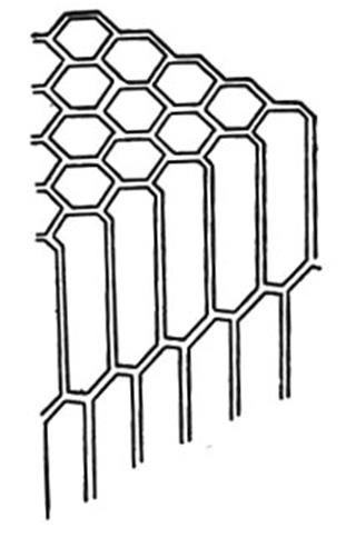華羅庚請教了昆蟲學家,找個實物蜂房來觀察,才知道既說“六角”又說“菱形”的意義。原來從正面來看蜂房是由一些正六邊形所組成,每一個角都是120°,并沒什么角度的問題。問題在于房底。蜂房并非六棱柱,而是把六棱柱的一端切下三個同樣的角,并搬移堆砌,使它的底部由三個相同的菱形所拼接而成(圖1)。而蜂巢就是由兩排這樣的蜂房底部和底部相接而成的(圖2)。