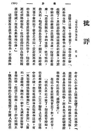 至于《福報》所載關于我的消息更無答復或表示之必要,我寫小說是要申訴自己的悲哀,亦即是我所感到的人類的悲哀。我始終反對把文學作宣傳工具。文藝是表現人生的面相,并不如某一般所想象的那么簡單,所以我的材料取自各方面。我為自己而寫小說,在我是非怎樣寫不可的。別人的批評我當然不管而且別人也不了解我。我近來的短篇小說具在,《福報》的話,明眼人當然不會相信。承你關切故告。