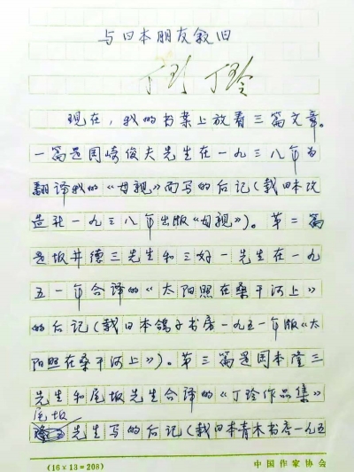 1984年春天,中國作家協會派出以巴金為團長的筆會代表團出席在日本東京舉辦的東京國際筆會第四十七屆大會。臨行前,為了展示中國文學的成就,營造友好氣氛,特地約請一批著名作家撰文并在報刊發表。丁玲寫了《與日本朋友敘舊》一文,約兩千字,回憶了與日本朋友岡崎俊夫、三好一、三好綾子、高畠穰、野間宏、中島碧的交流和友誼。文章用的是中國作家協會208字綠格小稿紙,文尾注明寫于1984年2月21日,字跡飄逸流暢,沒有修改,估計是秘書抄寫的謄清稿,唯有作者簽名頗像是丁玲的手跡,而且寫了兩遍??赡芏×嵊X得第一遍沒寫好,又寫了一遍。文章發表在1984年5月2日的《人民日報》上。