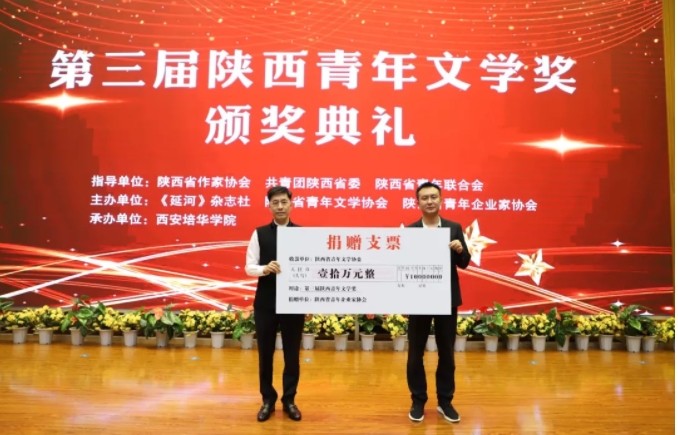典禮現場,陜西省青年企業家協會向陜西省青年文學協會捐贈十萬元,用于第三屆陜西青年文學獎的頒發。