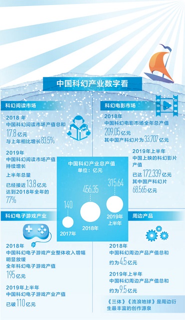 會上公布的《2019年度中國科幻產業報告》顯示,2018年中國科幻產業發展高速增長,總產值456.35億元,是前一年140億元的3.26倍,其中,科幻影視對科幻產業的帶動明顯。