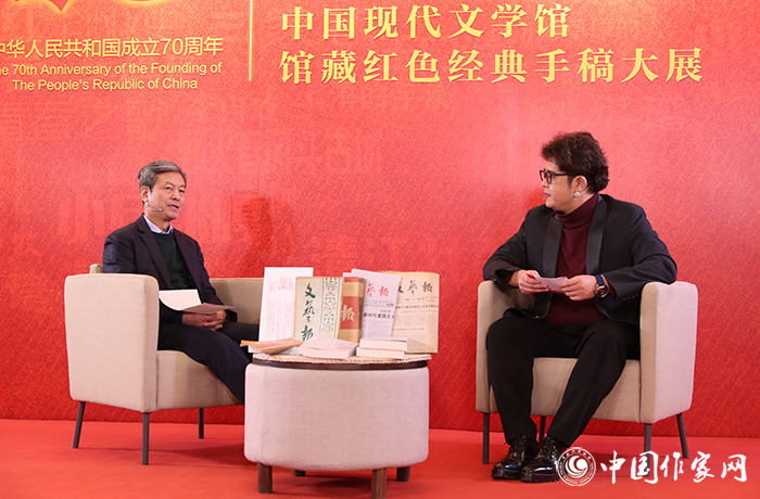 梁鴻鷹(左)介紹《文藝報》創刊背景