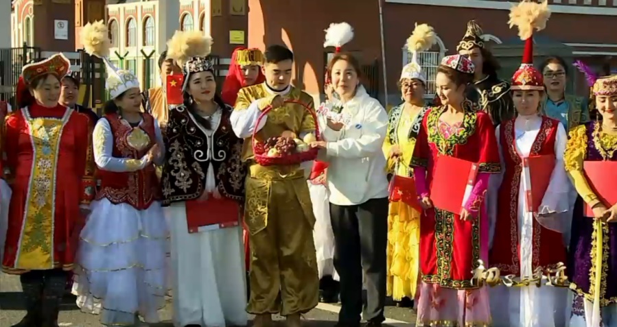 新疆塔城的少數民族朋友一同朗誦起《天山牧歌》中的《賽馬》
